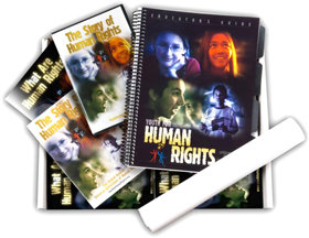 La Guía del Educador de Llevando los Derechos Humanos a la Vida es el núcleo del paquete educativo (arriba), conteniendo planes de lecciones, documentos de Derechos Humanos, procedimientos de denuncia, una lista de los organismos de Derechos Humanos, 30 anuncios de servicio público, la película La Historia de los Derechos Humanos y los folletos de La Historia de los Derechos Humanos.